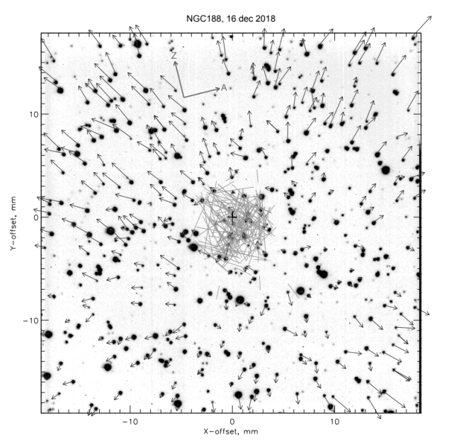 Fig. 6. Position of the aberration center (the directions marked by arrows) relative to the center of the primary focus turntable (the cross).