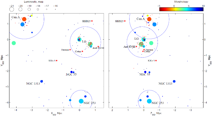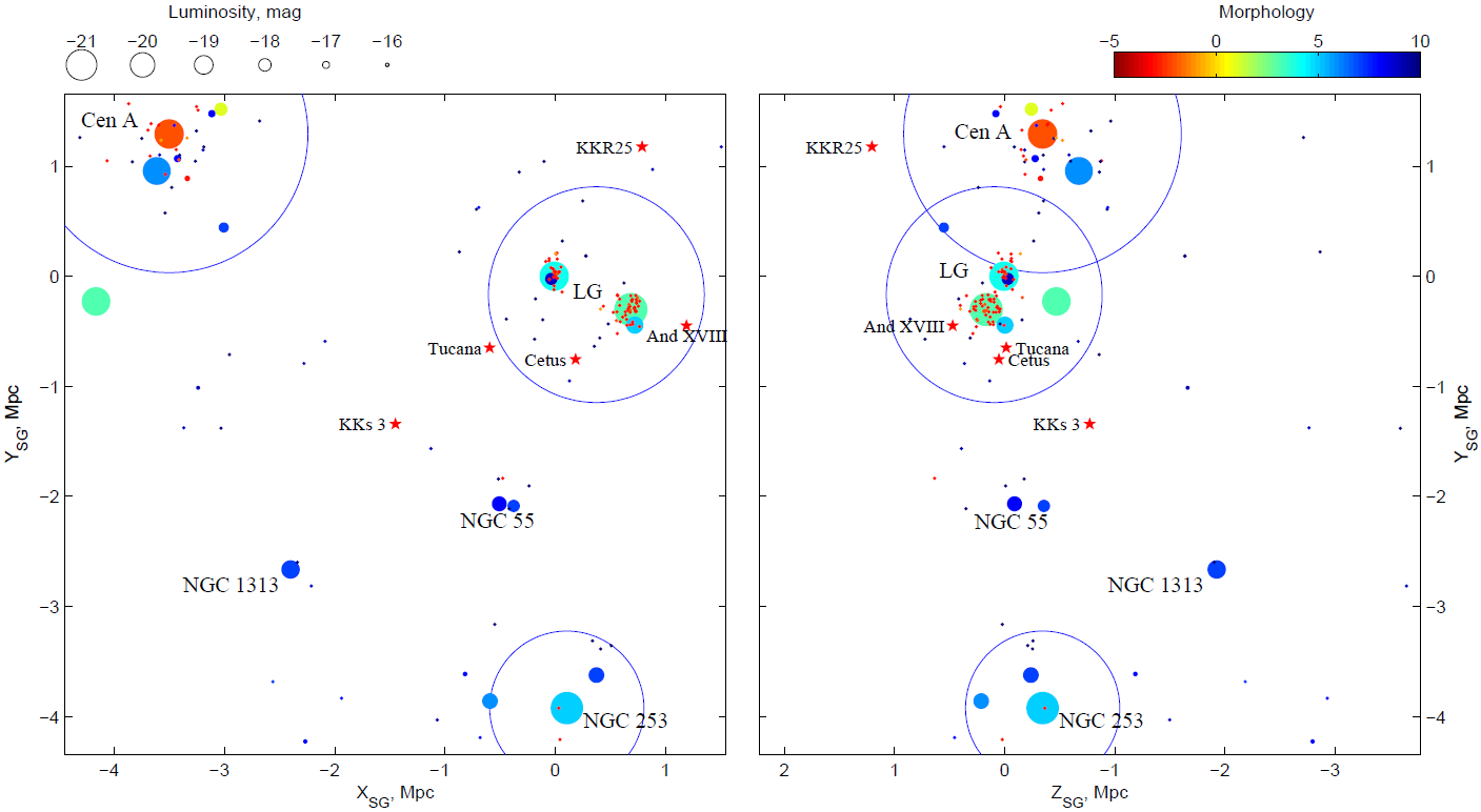 the Local Group and groups around NGC5128 (CenA) and NGC253. Red stars