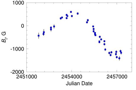Fig.1. Longitudinal magnetic field curve of the CP star HD965 in the time interval from 2000 to 2015. The blue squares are the measurements from the shift of oppositely circularly polarized Zeeman components