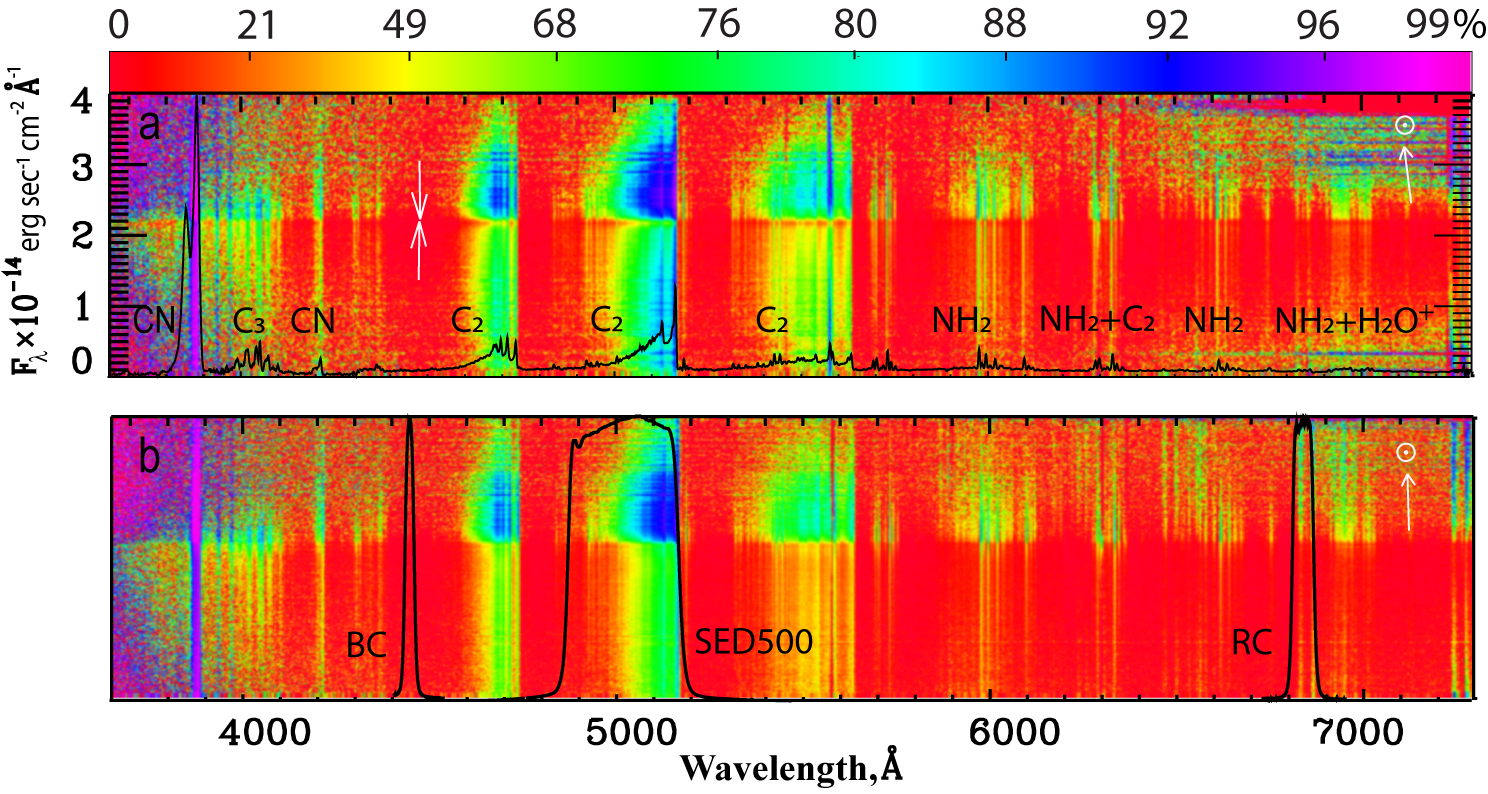 Fig.1. Spectral observations of comet C/ 2019 Y4 (ATLAS) on April 14 (top) and April 16, 2020 (below). The contribution of the gas component to the total flux (in percent) in each pixel of the slit image is shown in the form of a color diagram. The spectrum of the comet (a) and the normalized transmission curves of the ВС, RC, and SED500 filters (b) are superimposed on the diagram.