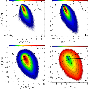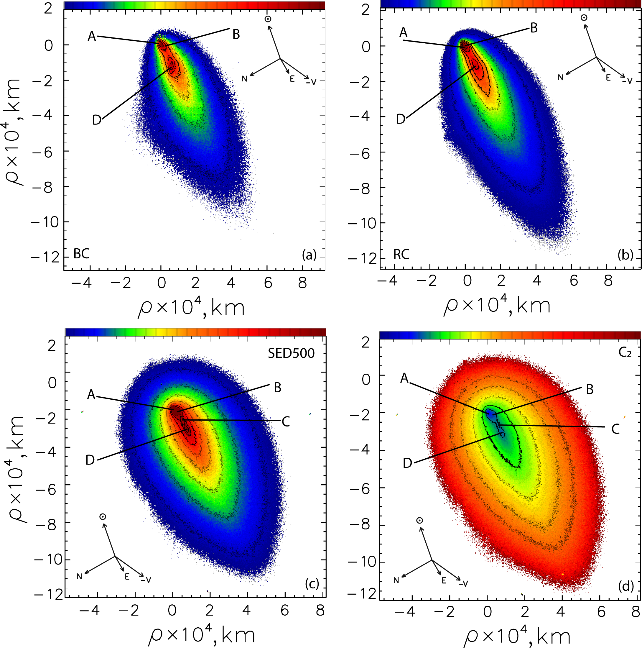 Fig.2. Direct images of comet C / 2019 Y4 (ATLAS) obtained with narrow-band filters: blue BC continuum (a), red RC continuum (b), the filter focused at the C2 band system, panel (d) shows the pure C2 intensity map after the dust-component subtraction. 4 fragments of the nucleus (A, B, C, D) are marked.