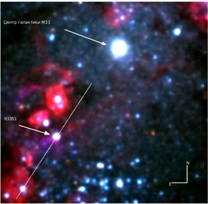 Fig.1. The map of the centre of the M33 galaxy. The brightest object is the core of the galaxy, - a compact star cluster comprising a supermassive black hole. The new LBV star N93351 is located down and to the left from the core. The white line shows the way the spectrograph slit was located during the observations. The star is located at the distance of 400 light years from the galactic core and it is in the zone of its gravitational effect. |