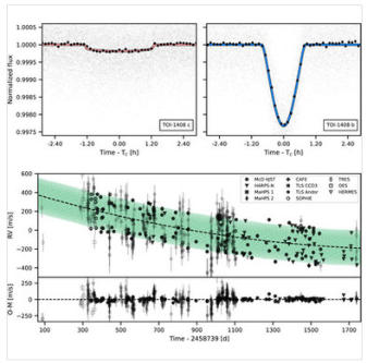 В статье Korth J., Chaturvedi P., Parviainen H., Carleo I., Endl M., Guenther E.~W., Nowak G., et al., 2024, ApJL, 971, L28. (doi:10.3847/2041-8213/ad65fd) авторы сообщают об обнаружении и определении параметров небольшой планеты TOI-1408c с периодом 2.2 дня. Планета находится ближе к центральной звезде, чем обнаруженная ранее планета TOI-1408b - горячий Юпитер на орбите с большим эксцентриситетом (P = 4.42 days, M = 1.86 ± 0.02 M_Jup, R = 2.4 ± 0.5 R_Jup). Две планеты близки к резонансному значению периодов 2:1, что приводит к значительным вариациям времени транзита (TTV) для обеих планет и вариациям продолжительности транзита для внутренней планеты. Амплитуда TTV для TOI-1408c составляет 15% от орбитального периода планеты, что является наибольшей амплитудой TTV относительно орбитального периода, измеренного на сегодняшний день. Фотодинамическое моделирование наземных наблюдений лучевой скорости (RV) и транзитных кривых блеска, полученных с помощью спутника Transiting Exoplanet Survey Satellite и наземных объектов, приводит к радиусу внутренней планеты 2,22 ± 0,06 R⊕ и массе 7,6 ± 0,2 M⊕, что позволяет классифицировать планету как “субнептун”. Отношрнир периодов 2:1 приводит к либрации резонансного аргумента внутренней планеты. Измерения RV подтверждают существование третьего тела с орбитальным периодом в несколько тысяч дней. Это открытие помещает систему в ряд редких систем, в которых вместе с горячим Юпитером наблюдается внутренняя маломассивная планета.