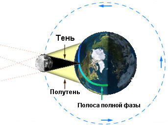Если на поверхность Земли падает тень Луны, то наблюдается полное затмение Солнца. След (дорожка) от тени Луны на поверхности Земли называют полосой полной фазы солнечного затмения. Эта полоса может достигать длиной до нескольких тысяч км, но шириной может быть не больше 270 км. Чтобы видеть Солнце, полностью затемненное Луной, нужно быть в полосе полного затмения.