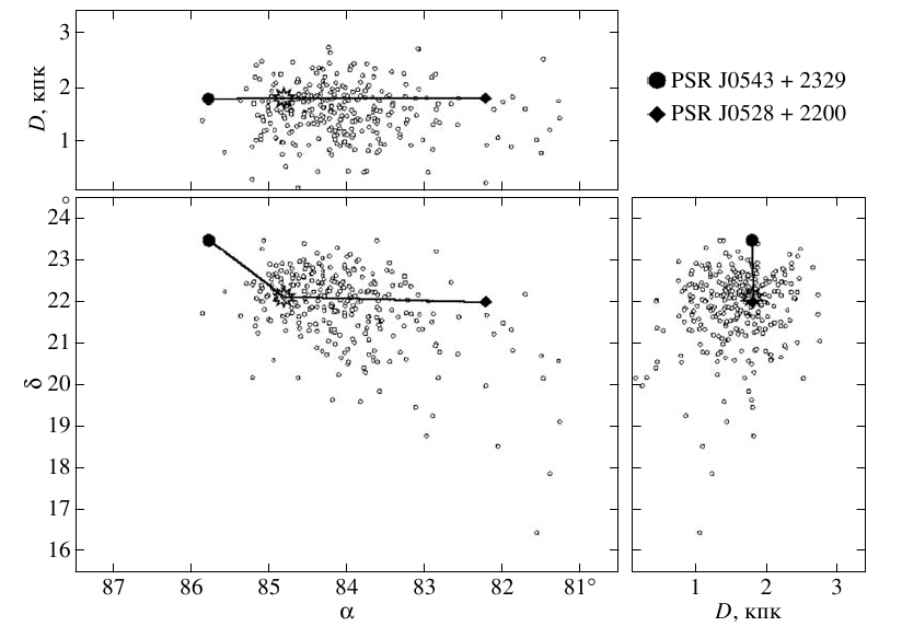 Рис.1. Пульсары J0543+2329 и J0528+2200. Проекции пространственной области, в которой измеренное минимальное расстояние между пульсарами не превышает ρ=10пк. Каждая точка на графике - место наибольшего сближения пульсаров для конкретной пары траекторий. Круг - положение более молодого пульсара в современную эпоху, ромб - положение более старого пульсара. Линии - траектории, на которых реализуется наименьшее найденное расстояние между пульсарами ρmin. Звездочка - область его достижения. Здесь ρmin=0.535пк. |