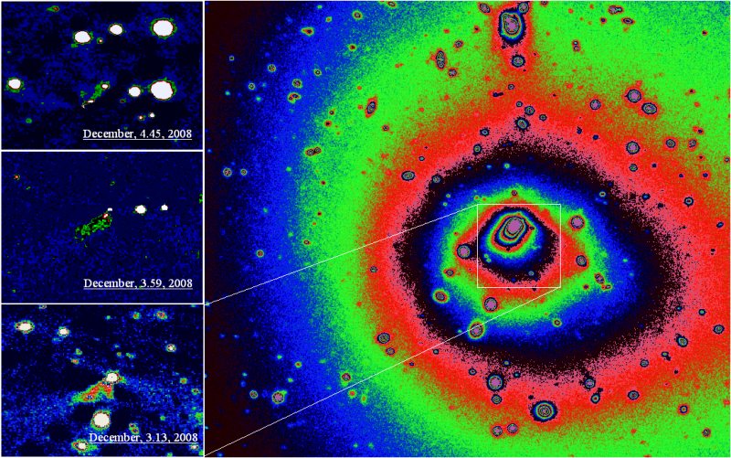 Рис.1. Справа - изображение кометы, полученное на 6-м телескопе САО РАН. Слева - джеты в пылевой коме, выделенные после обработки суммарных изображений кометы
