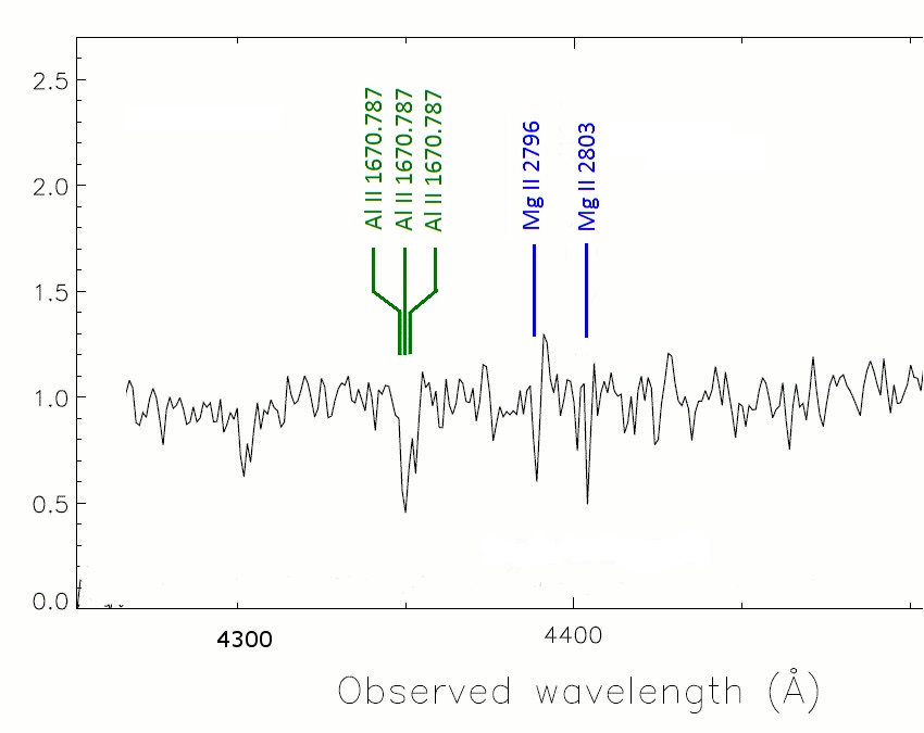 2. Абсорбционный дублет Mg II 2796/2803Å (рис. 2) с красным смещением z=0.56 найден в VLT/UVES-спектрах послесвечения GRB 021004 (с собственным z=2.33), т.е. для скоплений галактик с z≈0.56, лежащих на луче зрения на этот гамма-всплеск.