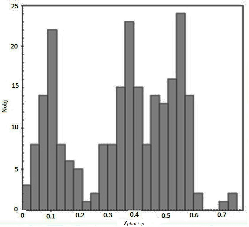 3. Обнаружена кластеризация галактик и в бóльшей области (∼3×3 кв.град.) вокруг GRB 021004 с эффективным пиком около z≈0.56 (рис. 3), обнаруживаемым по распределениям спектральных и фотометрических z из новых каталогов скоплений галактик, которые используют данные Sloan Digital Sky Survey III, включая и его Baryon Oscillation Spectroscopic Survey.
