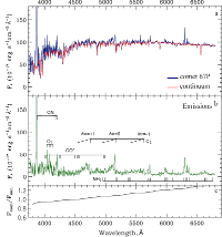 кометы с наложенным континуумом; b - спектр излучения; c - полиномиальная