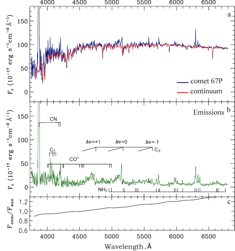Спектр кометы 67P, полученный 8 ноября 2015 г.: a - наблюдаемый спектр