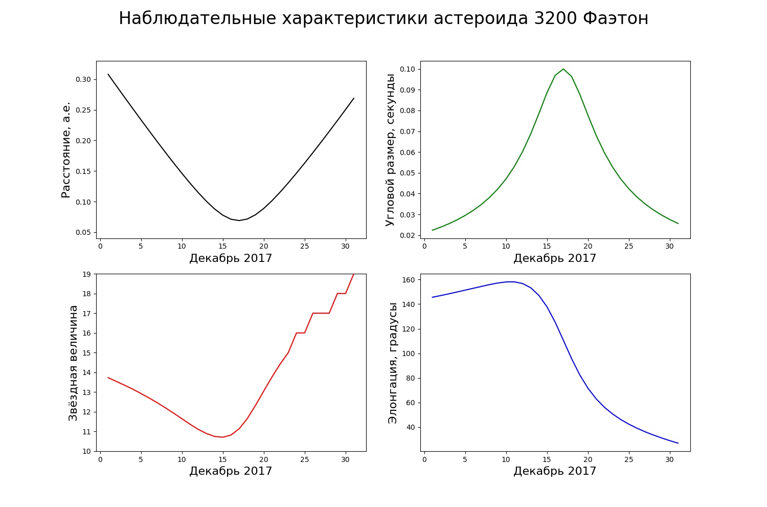 блеска (слева внизу) и угла Солнце-наблюдатель-Фаэтон (справа внизу)