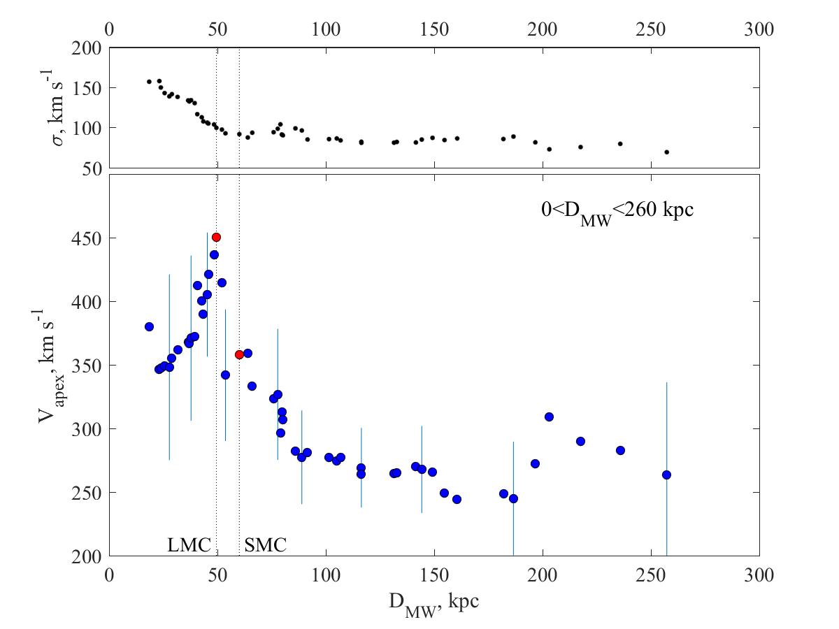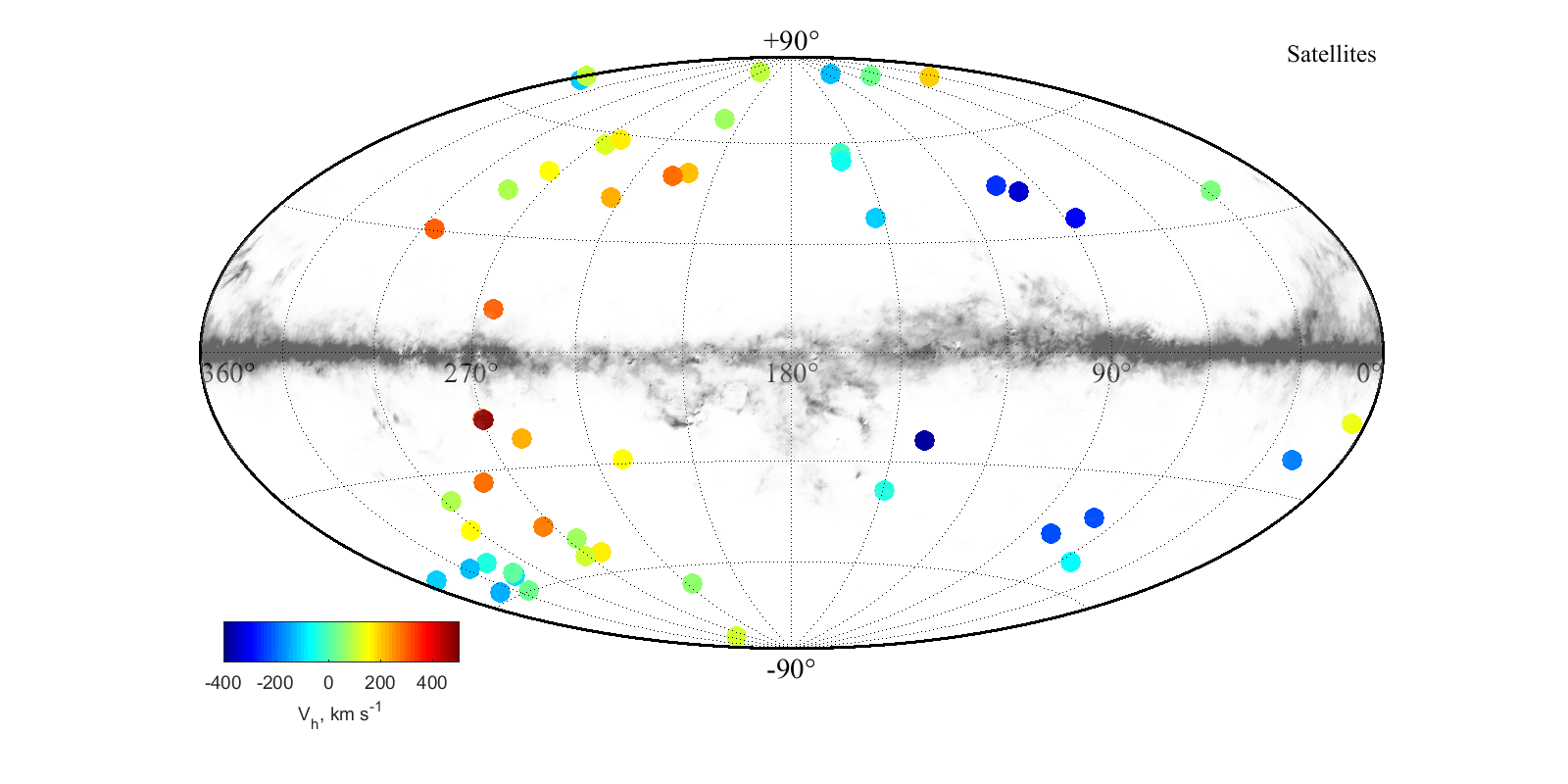 Карликовые галактики дают уникальную возможность для изучения эволюции Млечного Пути и Местной группы галактик в целом. Анализируя бегущий апекс Солнца на основе кинематики спутников Млечного Пути, мы обнаружили неожиданное поведение дипольного члена распределения лучевых скоростей в зависимости от галактоцентрического расстояния. Ближайшие спутники (<100 кпк) показывают коллективное движение с амплитудой 140-230 км/с относительно Галактики. Распределение же лучевых скоростей более далеких спутников является изотропным. Столь значительную вариацию апекса Солнца невозможно объяснить возможным вращением подсистемы спутников вокруг нашей Галактики. Для этого бы потребовалась бы чрезвычайно высокая скорость вращения порядка 1000 км/с, что очевидно нефизично. С нашей точки зрения, наиболее вероятным объяснением наблюдаемого эффекта является искажения поля скоростей вызванные первым пролетом Большого Магелланова Облака со своей свитой вокруг Млечного Пути и возмущением, оказываемым движением столько массивной галактики через рой спутников нашей Галактики. Численное моделирование показало, что наблюдаемая картина скоростей спутников будет наблюдаться при движении объекта массой 2 × 1011 M⊙ через группу спутников Млечного Пути. Работа выполнена в рамках гранта Министерства науки и высшего образования Российской Федерации № 075-15-2022-262 (13.МНПМУ.21.0003)