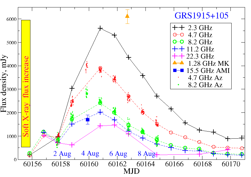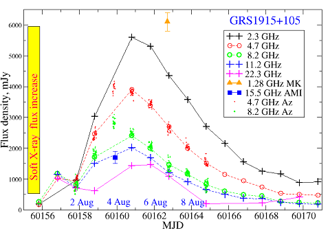 В многочастотных (2-30 ГГц) исследованиях на радиотелескопе РАТАН-600 рентгеновской двойной звезды с черной дырой (ЧД), прототипного микроквазара GRS 1915+105 была зарегистрирована экстремально яркая вспышка после перехода источника в крайне низкое и жесткое рентгеновское состояние. Яркость вспышки достигла 5.5 Ян на частоте 2.3 ГГц (то есть радиосветимость выросла до 1035 эрг/c), что выше когда-либо зарегистрированных значений за 30 лет с момента открытия объекта. Далее впервые мы проследили эволюцию вспышки на двух частотах 4.7 и 8.2 ГГц в новом для телескопа режиме многоазимутальных (МА) наблюдений, когда измерения проводились каждые 8.6 минуты 31 раз в сутки. Радиовспышка сопровождалась постепенным ростом потока в мягком рентгеновском диапазоне (MAXI, 2-20 кэВ). В оптически тонком радиоспектре синхротронного излучения электронов, спектральный индекс плавно изменился от +0.15 до −0.95 за первые восемь дней. Обнаруженные вариации потока на временах от 30 до 300 минут соответствуют физическому размеру области радиоизлучения от 4 до 40 астрономических единиц, вероятно, внутри струйного выброса. В восьми МА-измерениях впервые обнаружены квазипериодические осцилляции с амплитудой до 10% от среднего потока на временных интервалах от 30 до 100 минут. Мы связываем эту гигантскую вспышку GRS 1915+105 с формированием релятивистских струйных выбросов в процессе снижения аккреции вещества с нормальной звезды, когда, как стало недавно известно, сильный дисковый ветер одновременно и затеняет основной рентгеновский поток и снижает темп аккреции. Очевидное сходство вспышечного события в GRS 1915+105 с гигантскими вспышками в микроквазарах Cyg X-3, SS433 и Swift J1727.8-1613 подразумевает подобные физические процессы аккреции на черные дыры звездных масс.