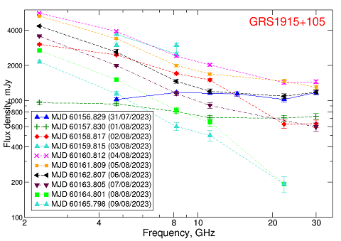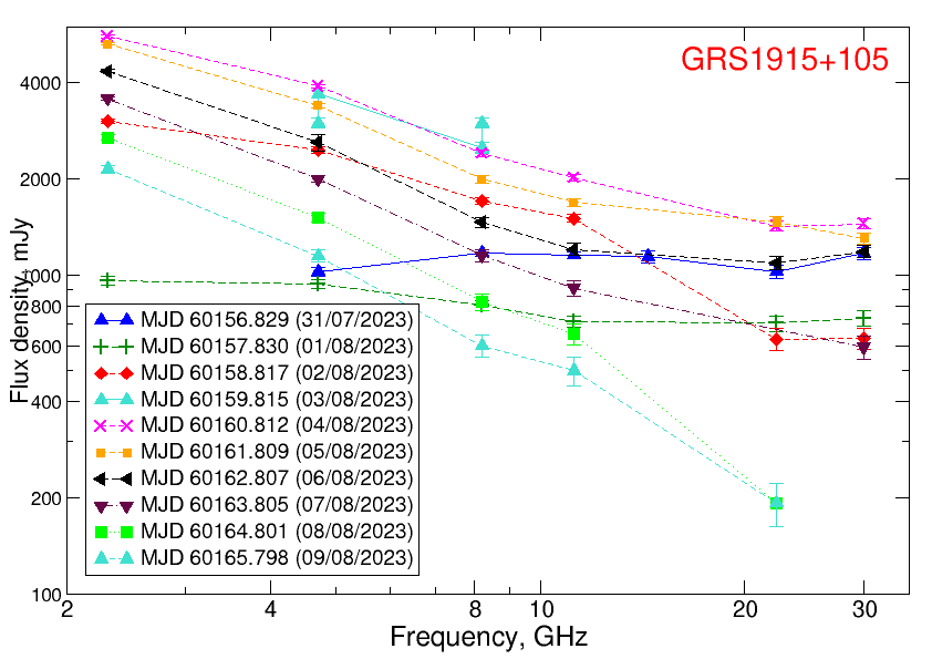 Рис. 2. Эволюция радиоспектра в течение первых десяти дней вспышки. Спектр становился постепенно круче, или в рентгеновской атрибутике, мягче.