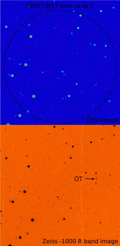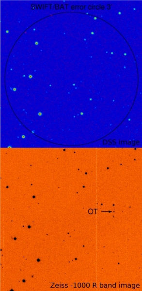 Рис.1. Вверху: DSS изображение области ошибок SWIFT/BAT (R фильтр). Внизу: прямой снимок, полученный на телескопе САО РАН Zeiss-1000 через полчаса после гамма-всплеска. Отмечено положение оптического транзиента GRB090726.