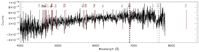Рис.2. Спектр оптического транзиента GRB090726 с отождествленными линиями, полученный на БТА через полтора часа после всплеска.