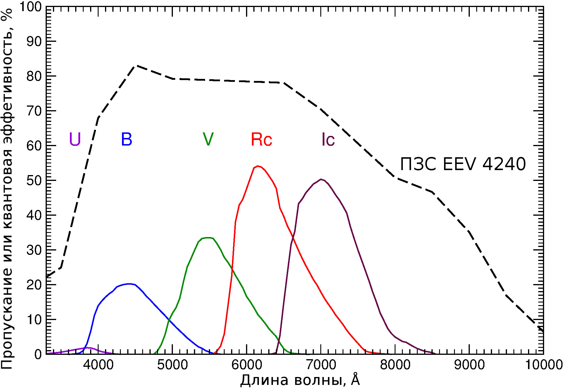 Широкополосные фильтры Джонсона-Казинса U, B, V, Rc, Ic, (3600-10000 Å) |