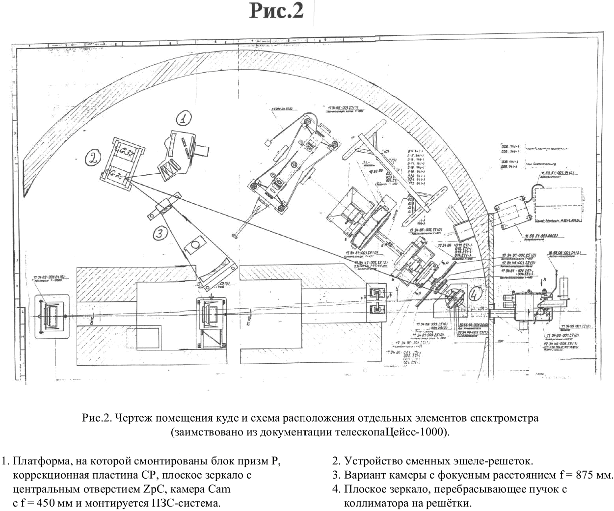 Спектрометр расположен в башне 1-м телескопа на втором этаже. Все основные элементы спектрометра расположены горизонтально. На рис. 2 в масштабе 1:65 дан чертеж помещения куде и схема расположения отдельных элементов спектрометра. Номером 1 обозначена платформа, на которой смонтированы блок призм P, коррекционная пластина CP, плоское зеркало с центральным отверстием ZpC, камера Сam с f = 450 мм и монтируется ПЗС-система. Номером 2 обозначено устройство сменных эшелле-решёток, номером 3 – вариант камеры с фокусным расстоянием f = 875 мм. Все элементы куде-эшелле спектрометра смонтированы на отдельных развязанных фундаментах. Исключение составляют платформы 1, 2 и 3 на рис. 2, которые смонтированы на специально изготовленных подставках- платформах, установленных прямо на полу помещения куде и не имеют специальных антивибрационных развязок. В связи с этим во время наблюдений для получения хорошей позиционной стабильности нужно соблюдать большую осторожность, чтобы случайно не сместить эти платформы с элементами спектрометра.